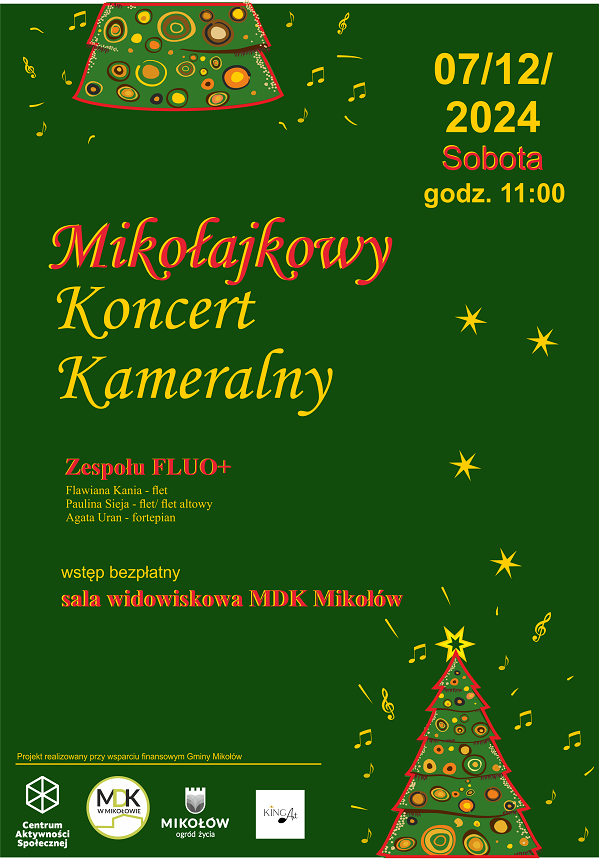 Już 7 grudnia 2024 roku o godzinie 11:00 w Miejskim Domu Kultury w Mikołowie odbędzie się Mikołajkowy Koncert Kameralny. To idealne uzupełnienie świątecznej atmosfery, którą stworzy trwający w tym czasie bożonarodzeniowy jarmark.