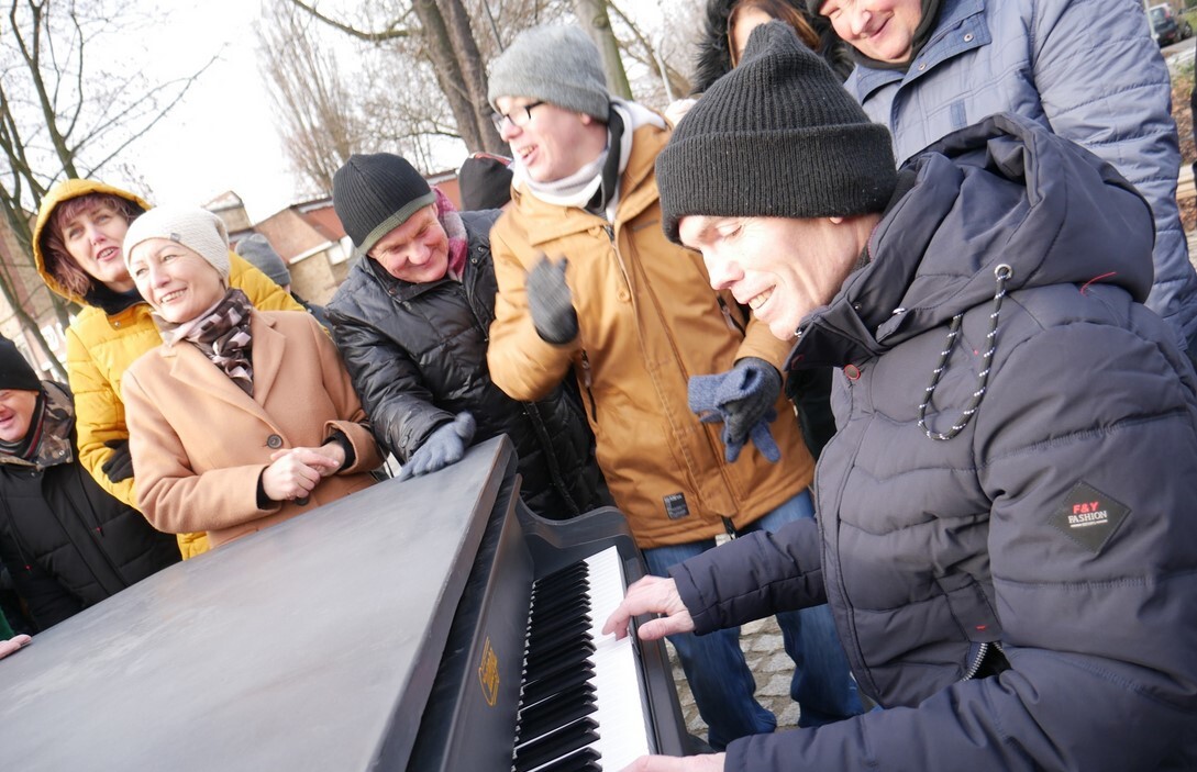 Potem spacerem goście z DPS dotarli do nowo wybudowanego centrum przesiadkowego i wiaduktu kolejowego. W okolicach dworca PKP była też okazja do przetestowania całorocznego fortepianu zewnętrznego.