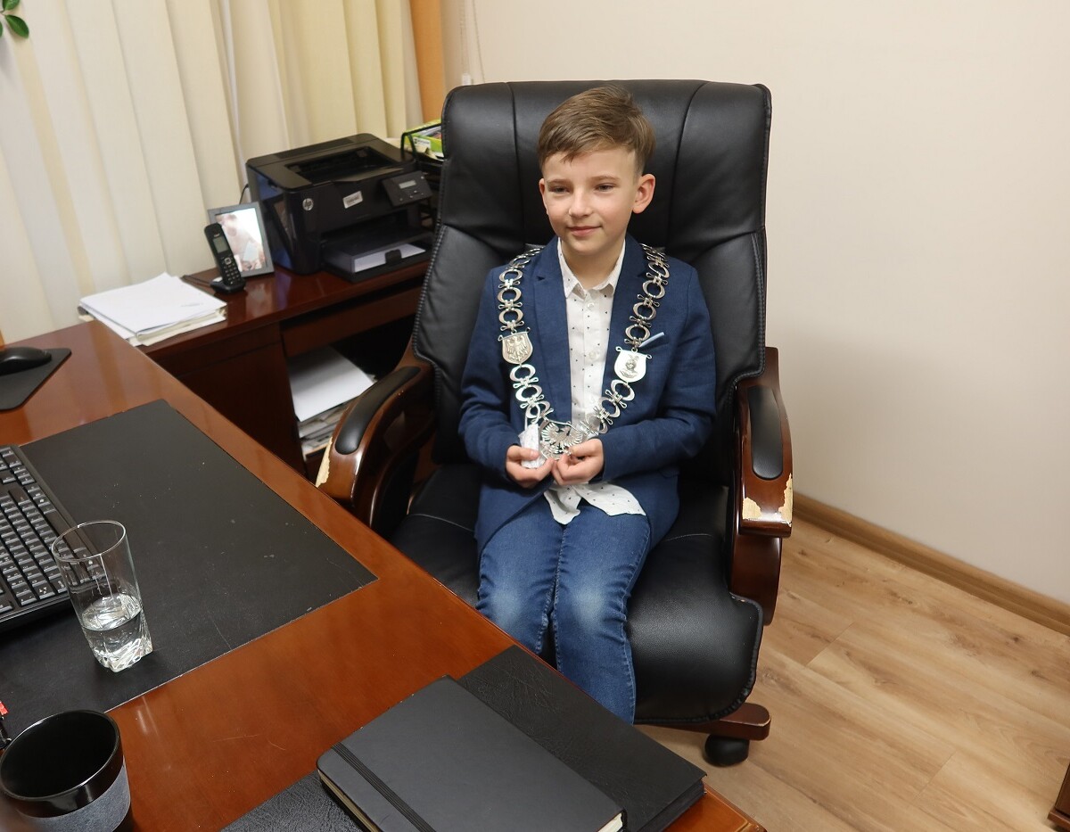 Wiktor zwyciężył w zabawie charytatywnej, dzięki której na kilka godzin objął stery nad miastem. W arkana zarządzania samorządem wprowadzał go zastępca Burmistrza Mateusz Handel, bo właśnie na jego zaproszenie Wiktor zawitał do Urzędu.