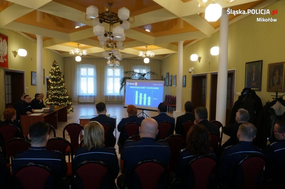 Wyniki pracy poszczególnych pionów i komórek jednostki, jej stan kadrowy, podejmowane inicjatywy społeczne oraz zrealizowane sprawy w ramach prowadzonych postępowań omówione zostały w najbardziej zwięzły i obrazowy sposób, a przedstawiona przez nadkom. Klimczaka multimedialna prezentacja pozwoliła zwizualizować referowane przez niego treści. W dalszej części narady, Komendant Powiatowy Policji w Mikołowie podziękował zebranym za wkład i współpracę w zakresie podnoszenia poziomu bezpieczeństwa mieszkańców powiatu mikołowskiego. Podziękował także przedstawicielom władz samorządowych za udzielone wsparcie finansowe dla policji w roku 2019. To właśnie dzięki niemu można było zrealizować, między innymi, ponadnormatywne służby policjantów na terenie Mikołowa i Ornontowic, pozyskać aż 4 nowe pojazdy służbowe, zarówno oznakowane jak i nieoznakowane. Wyposażono także budynek jednego z komisariatów.