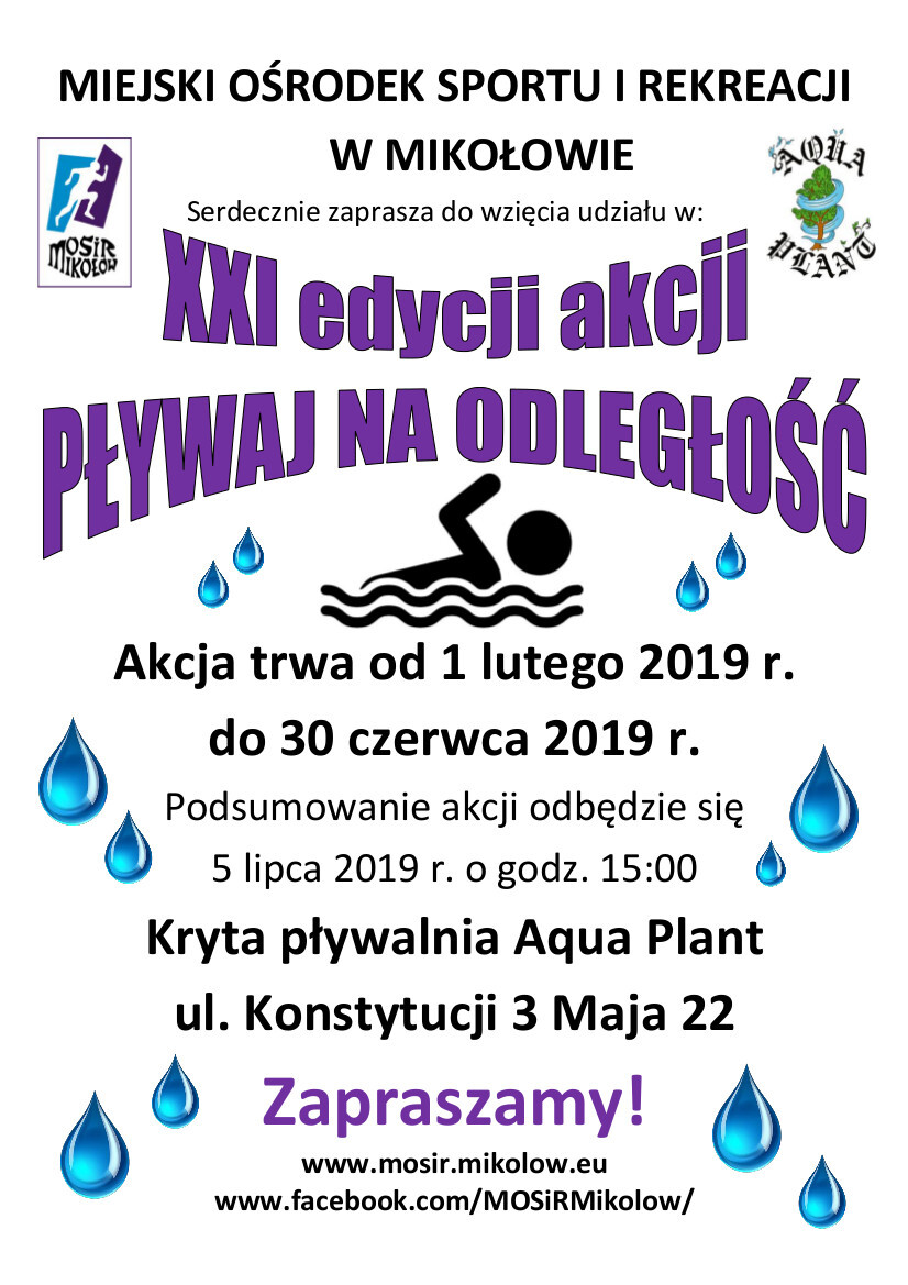 Serdecznie zapraszamy wszystkich miłośników pływania do wzięcia udziału w XXI edycji akcji "Pływaj na odległość", która odbywać się będzie w krytej pływalni Aqua Plant przy ul. Konstytucji 3 Maja 22, podczas godzin ogólnodostępnych.