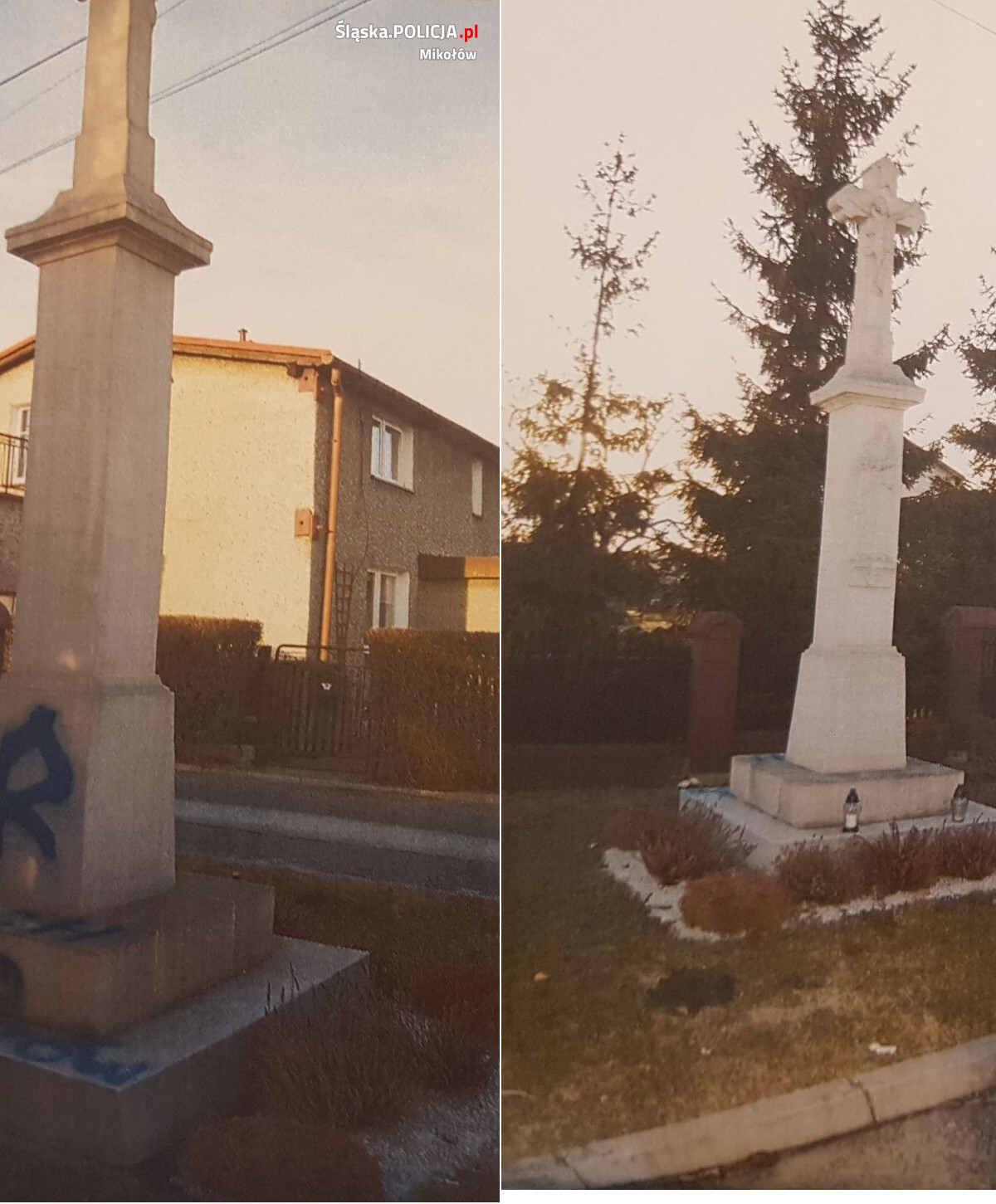 Do zniszczenia pomnika doszło 19 lutego br., kiedy to dotychczas nieznani sprawcy uszkodzili go poprzez naniesienie na niego napisów farbą. Dzięki wnikliwej pracy policjantów mikołowskiego Wydziału do Walki z Przestępczością Gospodarczą doszło przedwczoraj do ustalenia dwóch sprawców tego niegodziwego czynu. Okazali się nimi dwaj osiemnastoletni mieszkańcy Łazisk i Mikołowa. Sprawa ma charakter szczególny z uwagi na to, że mężczyźni za ten czyn odpowiedzą z Ustawy o Ochronie zabytków i opiece nad zabytkami. Wczoraj "graficiarze" usłyszeli prokuratorskie zarzuty, do których popełnienia obaj się przyznali. Teraz za swoje zachowanie odpowiedzą przed mikołowskim sądem.