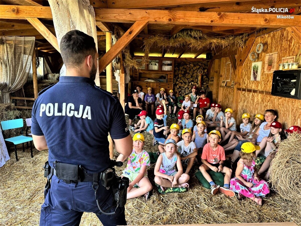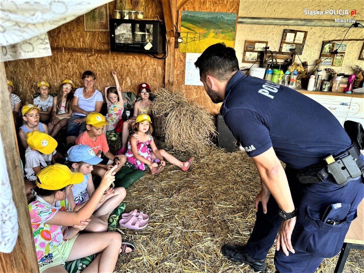 W piątek (28 czerwca) policjanci mikołowskiej komendy wybrali się na spotkanie z uczestnikami miejscowych półkolonii "Niezłe Ziółka", gdzie w otoczeniu przyrody i zwierząt opowiedzieli o zasadach, które należy stosować w czasie różnego rodzaju letniej aktywności. Sierż. Mateusz Wawoczny zachęcał dzieci do zachowania szczególnej ostrożności podczas przechodzenia przez oznakowane przejścia dla pieszych, jazdy na rowerze, rolkach i hulajnodze. Omówił, między innymi, zasady korzystania z numeru alarmowego 112 oraz przekazał dzieciom kilka ważnych porad jak bezpiecznie wypoczywać nad wodą. Z racji miejsca, w którym odbyło się spotkanie, policjanci wyjaśnili czym ochrona środowiska i dlaczego tak ważny wydaje się szacunek do zwierząt oraz jak zachować się w przypadku napotkania dzikiego zwierzęcia.