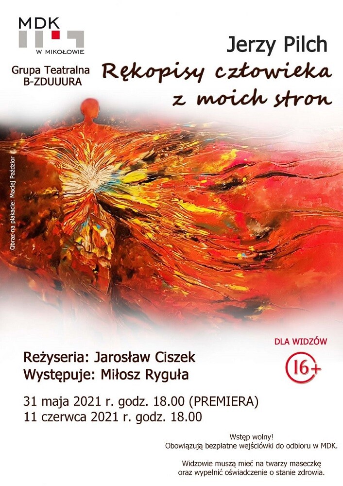 Miłosz Ryguła (jako aktor) i Jarosław Ciszek (jako reżyser) z Grupy Teatralnej B-ZDUUURA przy MDK w Mikołowie postanowili pochylić się nad literacką spuścizną zmarłego przed rokiem pisarza. Tak powstał monodram "Rękopisy człowieka z moich stron", na podstawie opowiadania pod tym samym tytułem z tomu "Moje pierwsze samobójstwo".