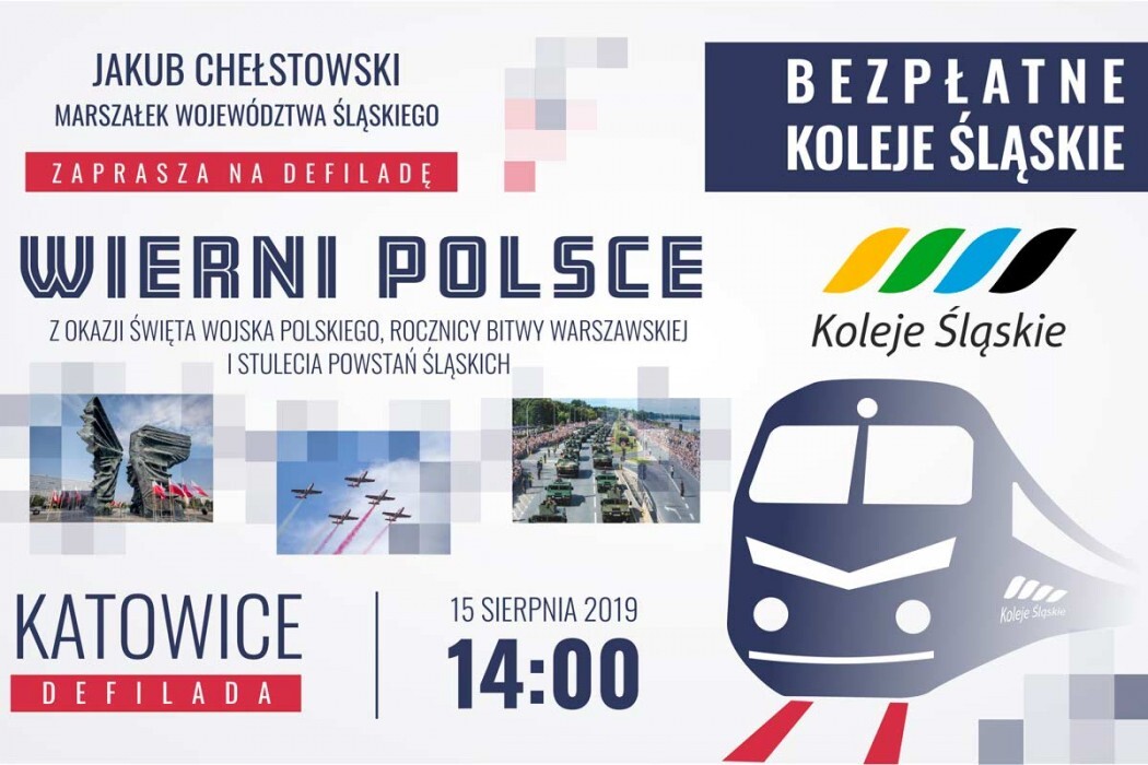 Zachęcam mieszkańców województwa śląskiego i gości do udziału w święcie patriotyzmu i skorzystania z transportu Kolejami Śląskimi. To ekologiczny i komfortowy środek komunikacji. 15 sierpnia wspólnie oddamy hołd Powstańcom. W 100-lecie wybuchu I Powstania Śląskiego wspomnimy w szczególny sposób bohaterów walczących o polskość Śląska – zachęca marszałek Jakub Chełstowski. - Wielka defilada wojskowa odbędzie się po raz pierwszy w Katowicach. To jest bardzo mocny symbol znaczenia naszego regionu dla Rzeczypospolitej. Jestem przekonany, że ta defilada przejdzie do historii regionu.