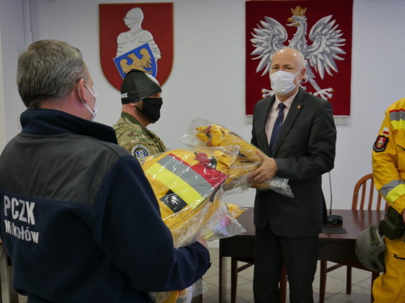 Starosta Mikołowski Mirosław Duży oraz naczelnik Wydziału Zarządzania Bezpieczeństwem Starostwa Powiatowego w Mikołowie Bartłomiej Depta przekazali wczoraj dowódcom orzeskiej "13 Grupy Poszukiwawczo-Ratowniczej Orzesze" ufundowane przez Powiat specjalne kombinezony "Scantex".