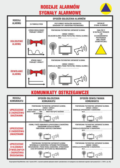 Trening alarmowy zostanie przeprowadzony z użyciem syren emitujących dźwięk modulowany trwający trzy minuty jako ogłoszenie alarmu i następujący po nim dźwięk ciągły trwający trzy minuty, który oznacza odwołanie alarmu.