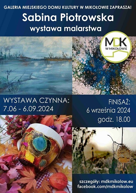 Od 7 czerwca w Galerii MDK prezentowana jest wystawa Sabiny Piotrowskiej, na którą złożą się obrazy, a także ceramika oraz fotografie, których uzupełnieniem są ekfrazy poetki Renaty Batko. Wystawa będzie dostępna do 6 września i na ten dzień planujemy jej uroczysty finisaż.