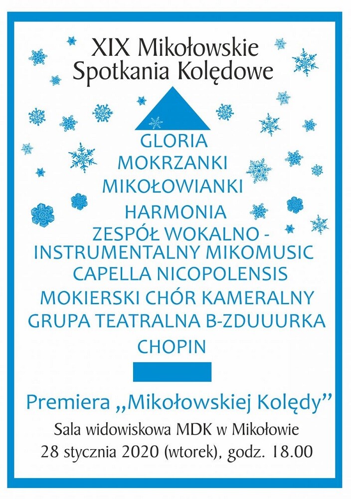 Kolędy łączą Mikołów! 28 stycznia 2020 r. (wtorek), tuż przed zakończeniem okresu kolędowego, MDK zaprasza na odbywające się po raz XIX Mikołowskie Spotkania Kolędowe. Ten wtorkowy wieczór wypełniony będzie najpiękniejszymi utworami bożonarodzeniowymi, które wykonają nasze chóry i zespoły. Zaśpiewają dla Państwa: Gloria, Chopin, Harmonia, Mikołowianki, Mokrzanki, Mokierski Chór Kameralny, Capella Nicopolensis, MikoMusic. Opowieść o toczącej się w czasie Świąt walce dobra ze złem przedstawi Grupa Teatralna B-zduuurka.