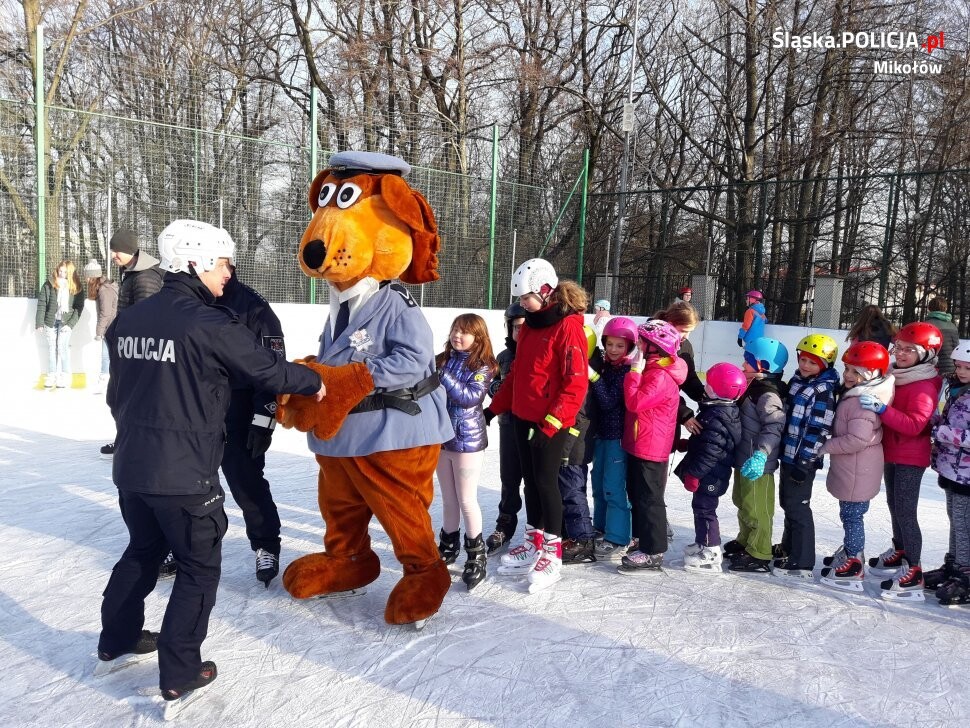 Od 13 do 26 stycznia 2020 r. uczniowie województwa śląskiego cieszą się zimowym wypoczynkiem. Jak widać aktywność w tym zakresie jest dosyć spora. Zobaczyć to można było wczoraj na miejskich lodowiskach w Mikołowie oraz Łaziskach Górnych. Słoneczna pogoda do założenia łyżew zachęciła na prawdę sporo osób. Obowiązkowo ubrał je także najbardziej rozpoznawalny wśród dzieci policjant powiatu mikołowskiego - sierżant Hektor. Młodzi mieszkańcy powiatu ochoczo ustawiły się w rzędzie, aby wraz policyjną maskotką szusować po lodzie. I aby przyjemne połączyć z pożytecznym, wraz z pluszowym misiem przyjechali także stróże prawa z mikołowskiej komendy i łaziskiego komisariatu. Mundurowi zachęcali do sportowej aktywności przypominając jednocześnie o podstawowych i najważniejszych zasadach bezpieczeństwa podczas zimowego wypoczynku. Szeroko pojęta profilaktyka dotyczyła między innymi wchodzenia na zamarznięte akweny i zbiorniki wodne, zabaw w bezpośredniej bliskości drogi oraz niebezpieczeństwach jakie mogą spotkać dzieci w trakcie zimowych kuligów organizowanych na drogach publicznych. Stróże prawa podkreślali również jak ważne jest bezpieczeństwo w ruchu drogowym oraz konieczność noszenia elementów odblaskowych po zapadnięciu zmroku. Wszyscy obecni na lodowisku otrzymali od policjantów odblaskowe opaski.