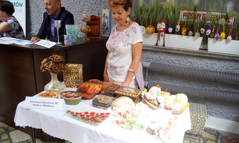 W korytarzach MDK swoje dzieła zaprezentowały m.in. członkinie Stowarzyszenia Pomocna Dłoń Krystyn i Sympatyków, pensjonariusze Dziennego Domu Pomocy w Mikołowie czy studenci UTW z Mikołowa i Łazisk Górnych.