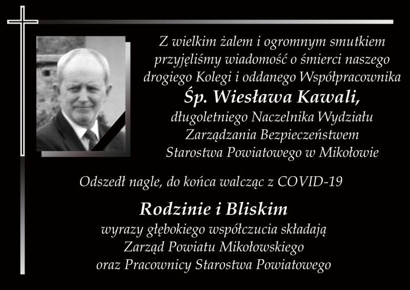 Starostwo Powiatowe w Mikołowie złożyło kondolencje dla rodziny Wiesława Kawala - długoletniego Naczelnika Wydziału Zarządzania Bezpieczeństwem Starostwa Powiatowego w Mikołowie.