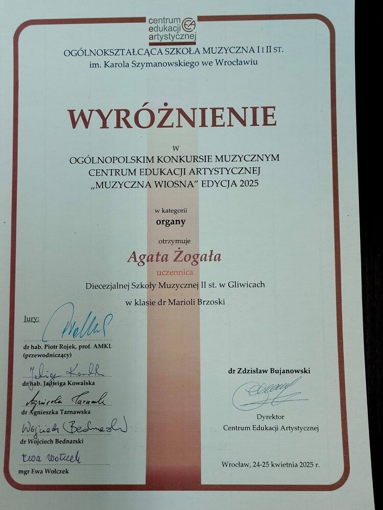 Agata Żogała, uczennica II Liceum Ogólnokształcącego im. rotmistrza Witolda Pileckiego w Mikołowie, osiągnęła kolejny wielki sukces na szczeblu ogólnopolskim! Podczas Ogólnopolskiego Konkursu Muzycznego Centrum Edukacji Artystycznej „Muzyczna Wiosna 2025”, który odbył się w dniach 24-25 kwietnia we Wrocławiu, zdobyła wyróżnienie w kategorii organy.