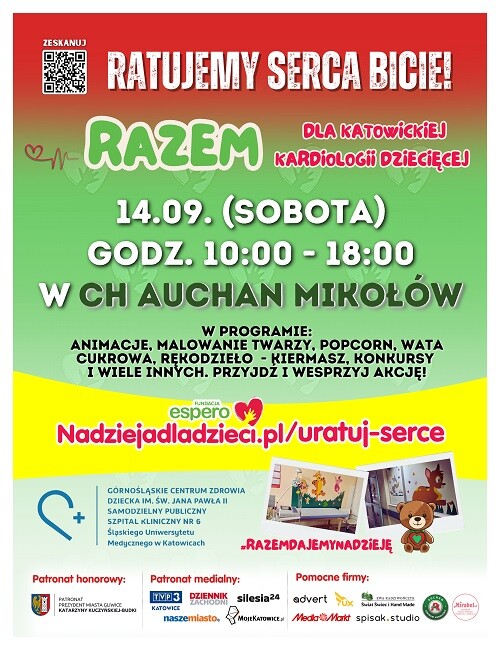 Już 14 września 2024 roku Fundacja Espero zaprasza na wyjątkowe wydarzenie charytatywne pod hasłem „Ratujemy serca bicie! Razem dla katowickiej kardiologii dziecięcej”, które odbędzie się w Ch Auchan. Celem wydarzenia jest wsparcie oddziału kardiologii dziecięcej Górnośląskiego Centrum Zdrowia Dziecka w Katowicach poprzez zbiórkę funduszy na zakup nowoczesnych kardiomonitorów.