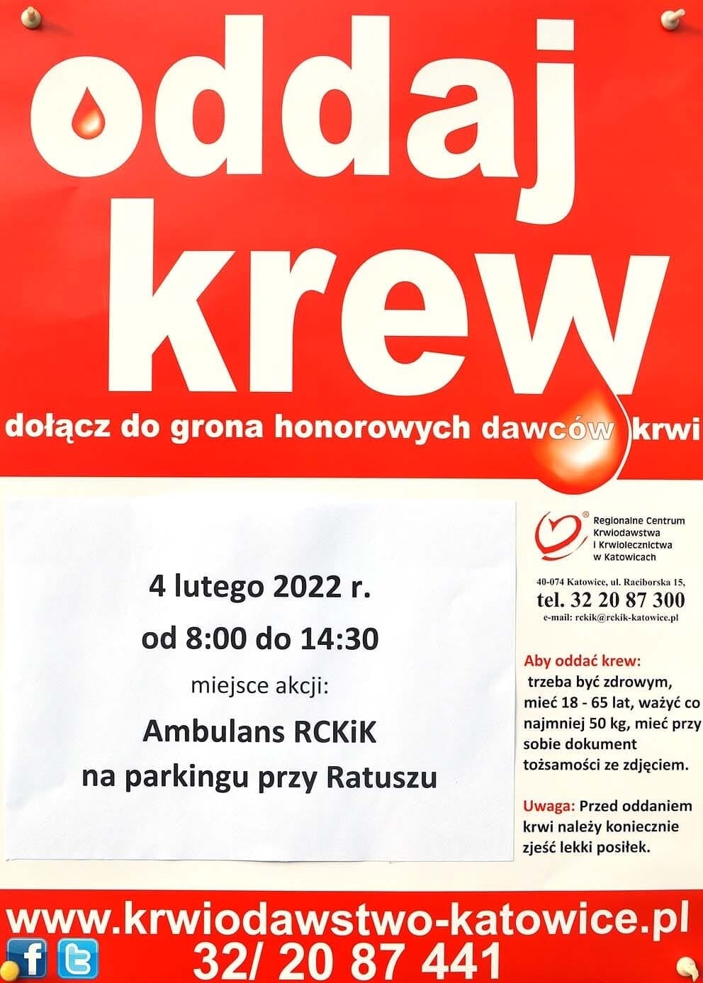 Już dziś, w piątek 4 lutego, na wszystkich chętnych czeka ambulans RCKiK na parkingu przy mikołowskim ratuszu od godziny 8:00 do 14:30.