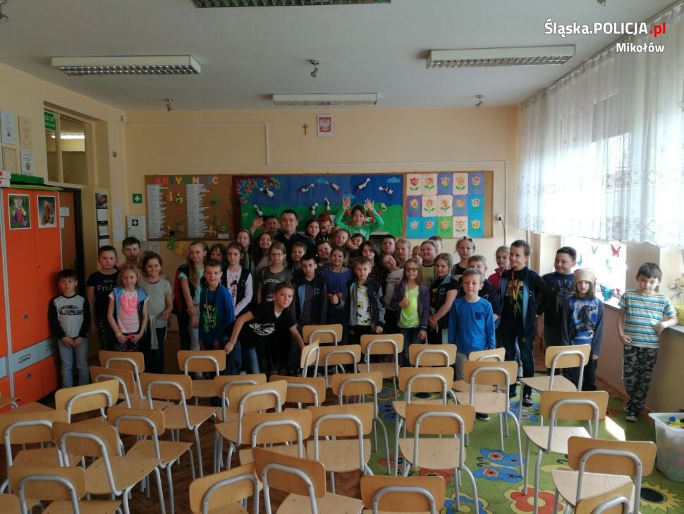 Dzielnicowy rejonu nr 6, asp. szt. Maciej Dobrowolski odwiedził uczniów mokierskiej szkoły podstawowej oraz uczniów i przedszkolaków Zespołu Szkolno- Przedszkolnego w Mikołowie.