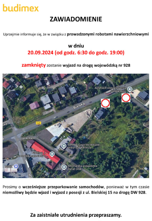Mieszkańcy okolic drogi wojewódzkiej nr 928 muszą przygotować się na kolejne utrudnienia. W związku z prowadzonymi robotami nawierzchniowymi, w dniu 20 września 2024 r. w godzinach od 6:30 do 19:00 nastąpi zamknięcie wjazdu i wyjazdu z posesji zlokalizowanej przy ul. Bielskiej 15 na DW 928.