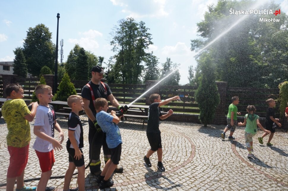 Policjanci wspólnie ze strażakami, w myśl akcji "Kręci mnie bezpieczeństwo..." oraz "Bezpieczne wakacje 2018", odwiedzili wczoraj dzieci spędzające swój wolny, wakacyjny czas w gminie Wyry. W spotkaniu udział wzięli najmłodsi ze Świetlicy Środowiskowej oraz dzieci biorące udział w cyklicznych zajęciach organizowanych przez Dom Kultury w Gostyni. Mundurowi, podczas dwugodzinnego spotkania radzili, uczyli i ostrzegali jak bezpiecznie wypoczywać podczas wakacji i korzystać z ich uroków, unikając potencjalnych zagrożeń. Dodatkową atrakcją, była możliwość zapoznania się ze sprzętem wykorzystywanym w codziennej służbie przez policjantów i strażaków. Najwięcej emocji jednak wśród milusińskich wzbudził pokaz strażaków, dzięki któremu zażyły odrobiny ochłodzenia w ten upalny dzień.