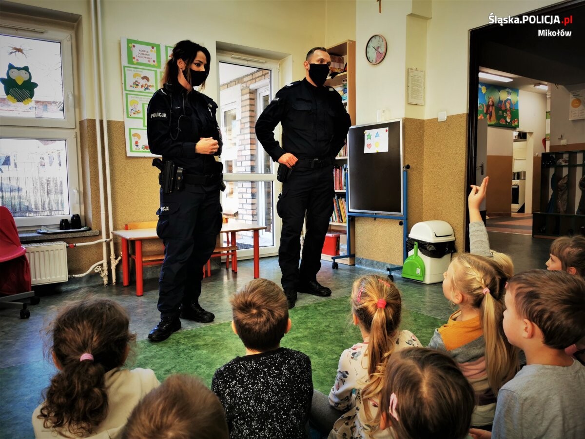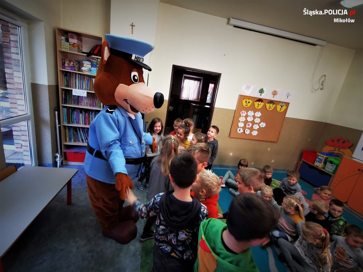 Młodym mikołowianom przypomniano o bezpiecznym podróżowaniu w drodze do i z przedszkola zachęcając ich tym samym do noszenia odblaskowych elementów. Dzielnicowy zwrócił uwagę na normy postępowania w przypadku kontaktu z nieznajomą osobą. Razem z sierż. Kempką zaprezentował codzienne wyposażenie oraz elementy policyjnego munduru.