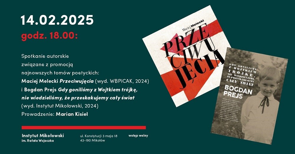 Instytut Mikołowski zaprasza na wyjątkowe spotkanie autorskie z Maciejem Meleckim i Bogdanem Prejsem, które odbędzie się 14 lutego 2025 o godz. 18:00. Podczas wydarzenia zostaną zaprezentowane ich najnowsze tomy poetyckie: „Przeciwujęcia” Macieja Meleckiego oraz „Gdy goniliśmy z Wojtkiem trójkę, nie wiedzieliśmy, że przeskakujemy cały świat” Bogdana Prejsa.
