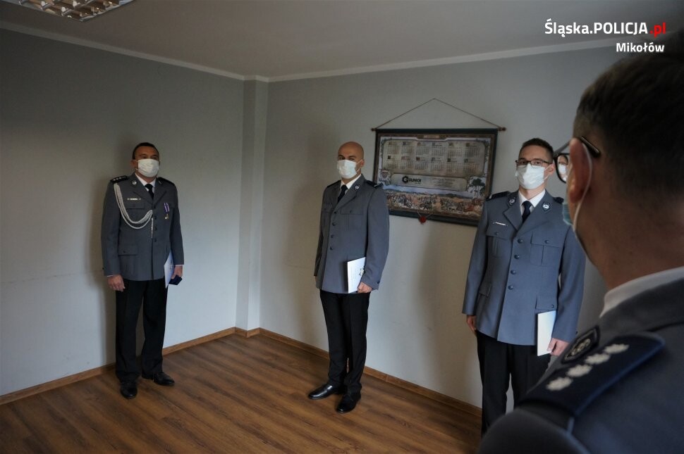 Niby tak samo, a jednak inaczej. Z uwagi na stan epidemii, tradycyjna jak dotąd uroczystość Święta Policji musiała przybrać nową, podporządkowaną sanitarnemu rygorowi formę. Nie było możliwości, aby jak co roku, spotkać się w jednym miejscu i uczestniczyć w długo przygotowywanych obchodach ani też zaprosić na uroczystość gości. Dlatego też Komendant Powiatowy Policji w Mikołowie, nadkom. Dariusz Klimczak wraz ze swoim Zastępcą, nadkom. Dariuszem Waligórą spotkał się z policjantami na skromnym, choć uroczystym apelu, odwiedzając poszczególne komórki mikołowskiej komendy oraz komisariaty w Orzeszu i Łaziskach Górnych. Podczas kilkuminutowego spotkania wręczył policjantom akty mianowania i wyraził podziękowanie za dotychczasową pracę oraz zaangażowanie w codziennej służbie. Czas ten był także okazją do wręczenia odznaczeń, nawiązujących jeszcze do ubiegłorocznych uroczystości obchodów 100-lecia odzyskania niepodległości - Krzyża Niepodległości. Z rąk Wiceprzewodniczącego Zarządu Wojewódzkiego Niezależnego Samorządnego Związku Zawodowego Policjantów woj.śląskiego - asp. sztab. Artura Mendery otrzymali je: nadkom. Dariusz Klimczak, nadkom. Dariusz Waligóra, kom. Lucjan Kret, asp.sztab. Krzysztof Czech, nadkom. Sebastian Krzysztofik, asp.sztab. Sławomir Basoń, podisnp. Anna Musioł, asp. sztab. Dariusz Klyta i st. asp. Marek Nowara.