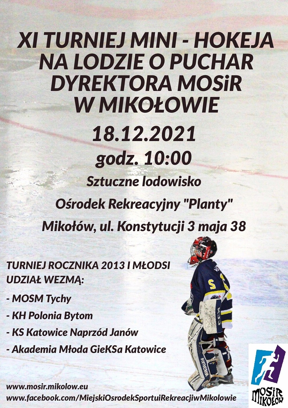 W sobotę 18 grudnia o godz. 10:00 na terenie OR Planty odbędzie się "XI Turniej mini – hokeja na lodzie o Puchar Dyrektora MOSiR”. Turniej skierowany jest dla dzieci z rocznika 2013 i młodszych.