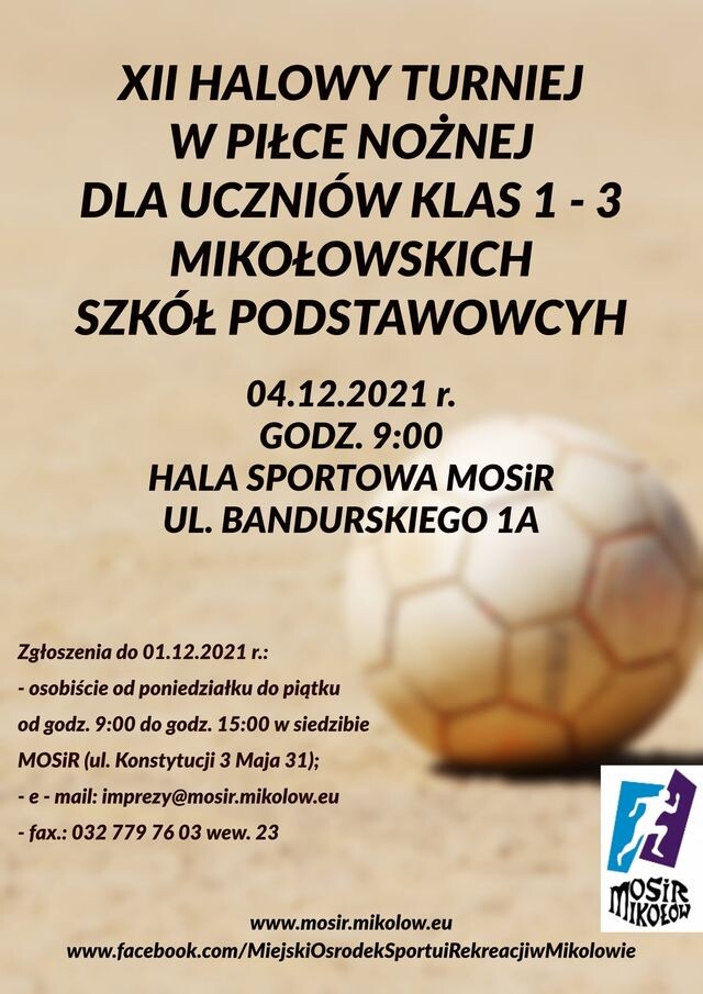Miejski Ośrodek Sportu i Rekreacji zaprasza uczniów klas 1-3 mikołowskich szkół podstawowych do wzięcia udziału w XII Halowym Turnieju piłki nożnej, który odbędzie się 4 grudnia br. w Hali Sportowej MOSiR.