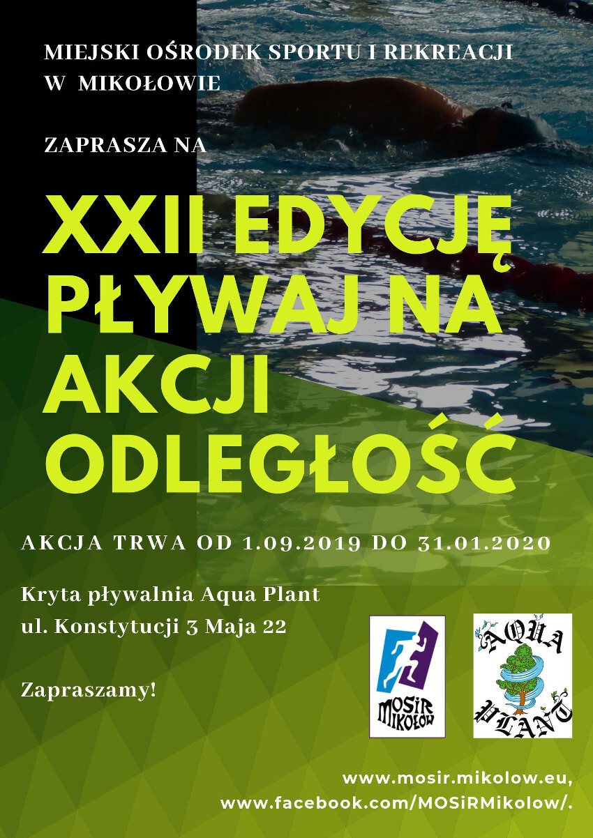 Serdecznie zapraszamy wszystkich miłośników pływania do wzięcia udziału w XXII edycji akcji "Pływaj na odległość", która będzie odbywać się w krytej pływalni Aqua Plant przy ul. Konstytucji 3 Maja 22, podczas godzin ogólnodostępnych.