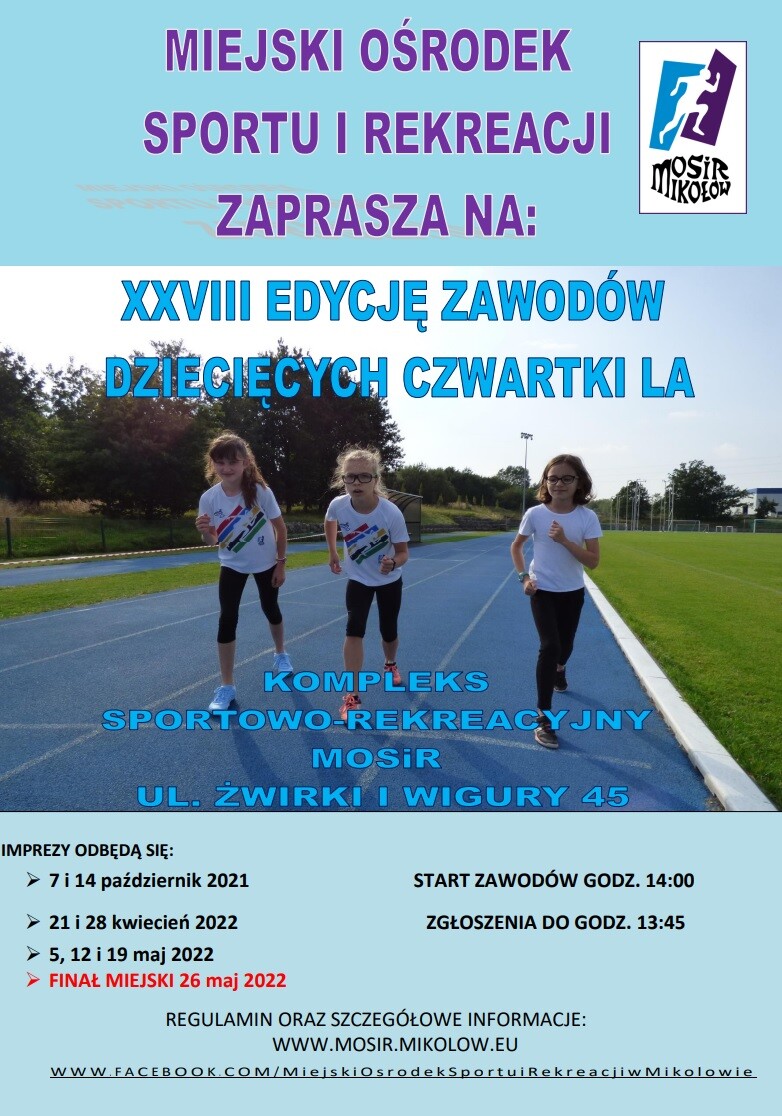 Miejski Ośrodek Sportu i Rekreacji w Mikołowie serdecznie zaprasza wszystkich uczniów szkół podstawowych do wzięcia udziału w XXVIII edycji zawodów dziecięcych „Czwartki Lekkoatletyczne”. Zawody będą odbywać się w wyznaczonych terminach o godzinie 14:00 na Kompleksie Sportowo – Rekreacyjnym MOSiR przy ul. Żwirki i Wigury. Finał ogólnopolski odbędzie się w czerwcu 2022 r. w Łodzi.