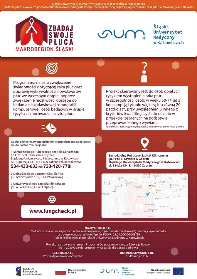 Śląski Uniwersytet Medyczny w Katowicach jest realizatorem projektu „Badania przesiewowe za pomocą niskodawkowej tomografii komputerowej metodą poprawy wyleczalności raka płuc w makroregionie śląskim”.