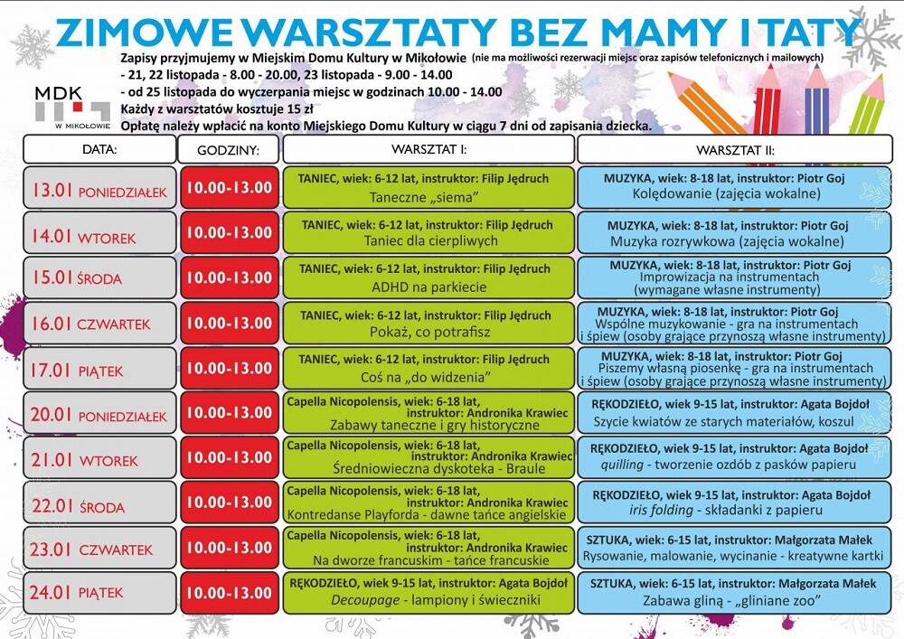 Każdy z warsztatów kosztuje 15 zł. Opłatę należy wpłacić na konto Miejskiego Domu Kultury w ciągu 7 dni od zapisania dziecka.